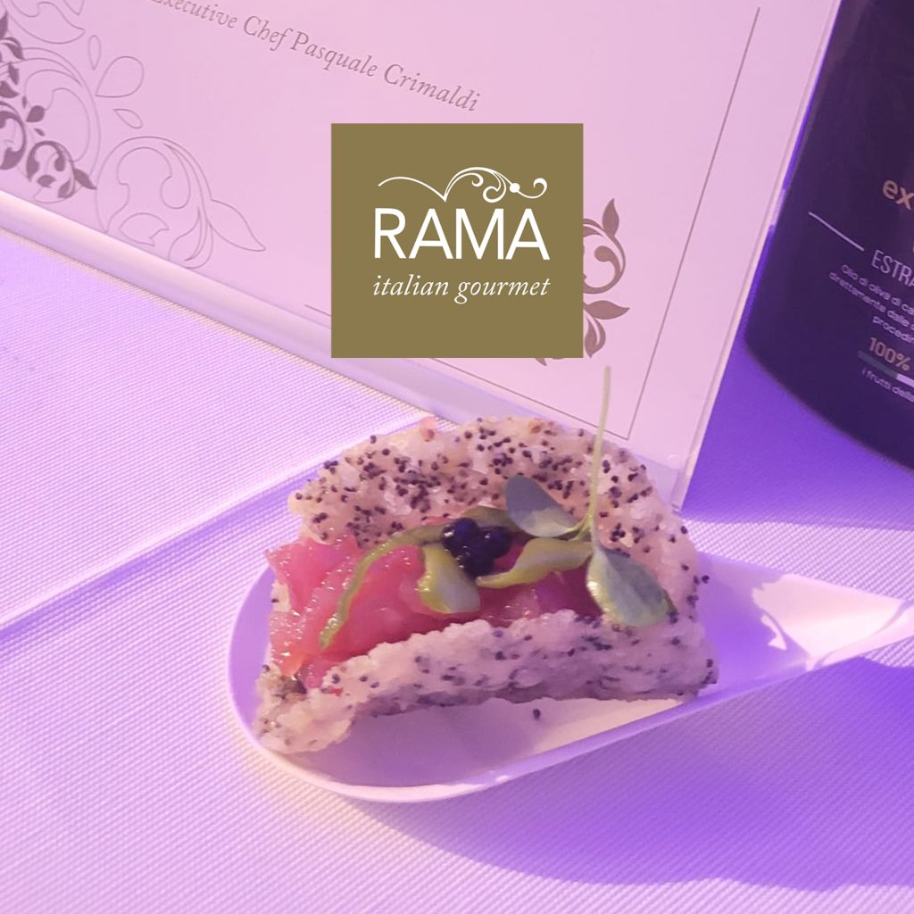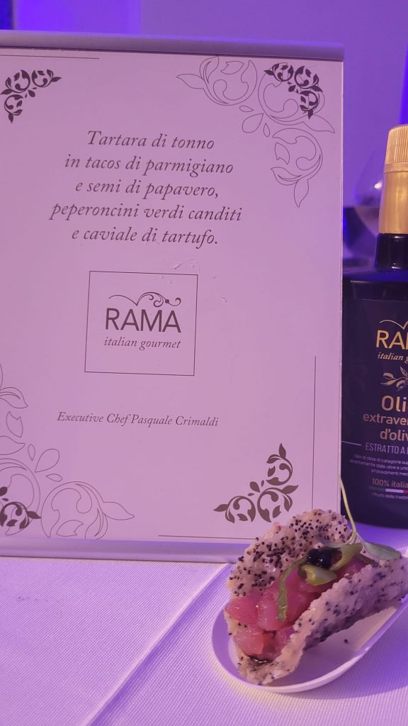 Rama è stata presente per tutti i tre giorni con suo staff che ha supportando tecnicamente la degustazione dei pregiati vini e agevolando i workshop. Nella serata finale ha presentato uno nuovo finger studiato per l’occasione e preparato dal nostro executive chef Pasquale Crimaldi: Tartara di tonno in tacos di parmigiano e semi di papavero, peperoncini verdi canditi e caviale di tartufo, che è stato molto apprezzato.