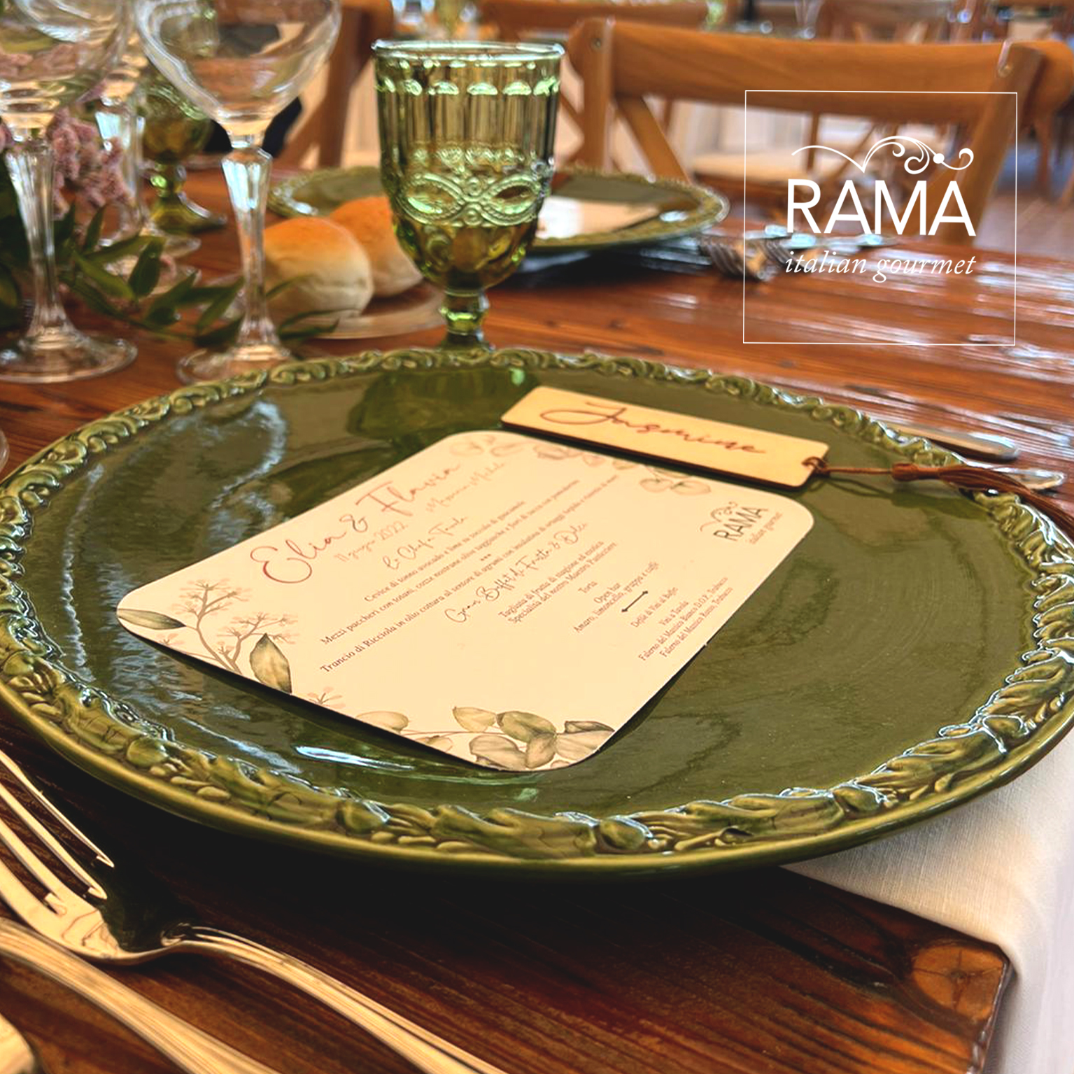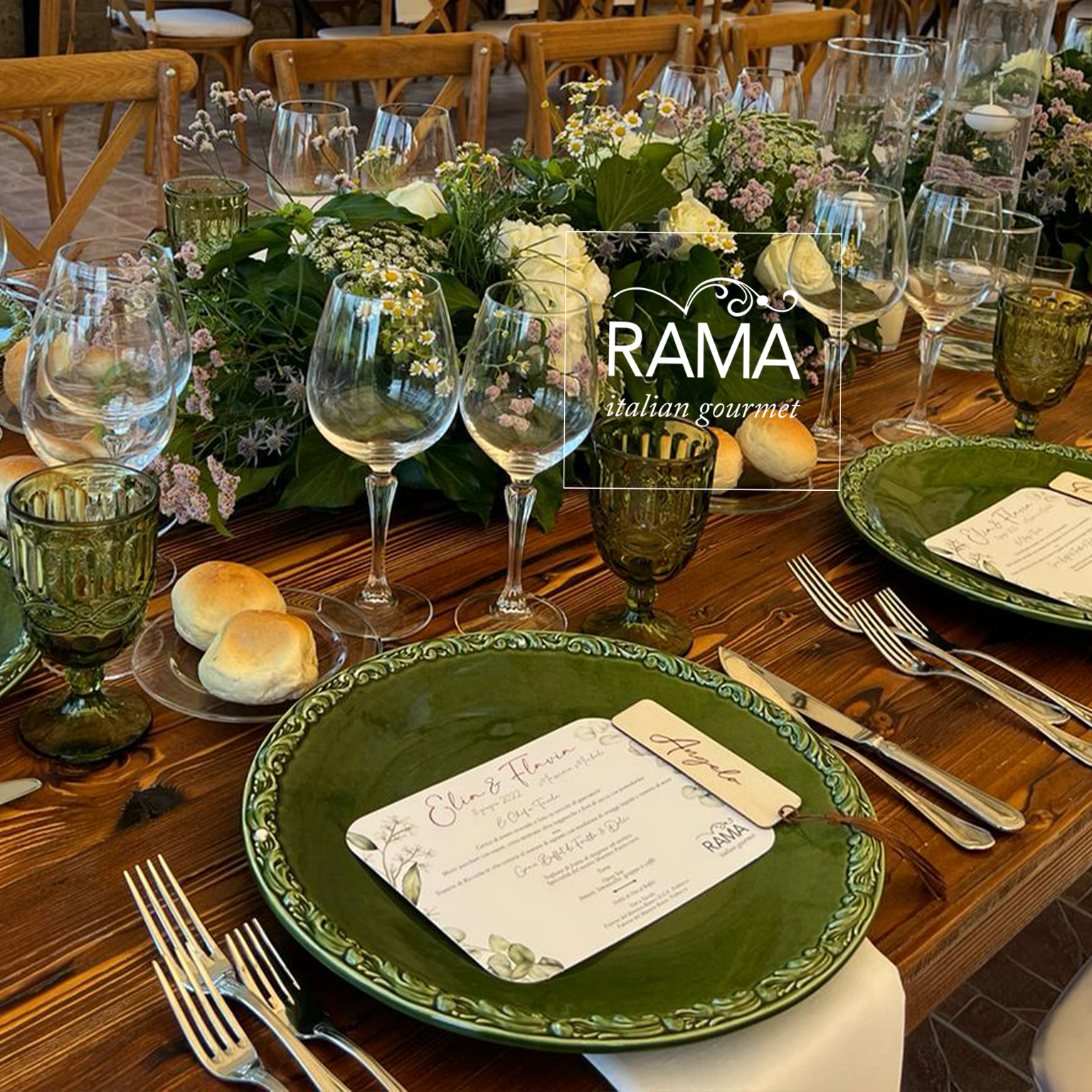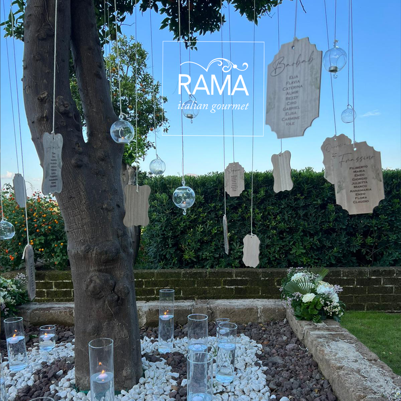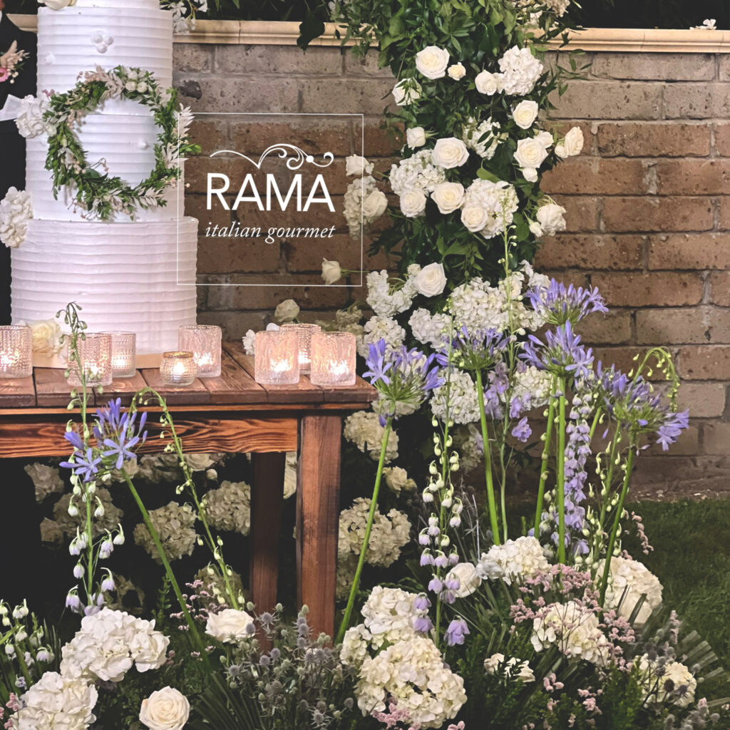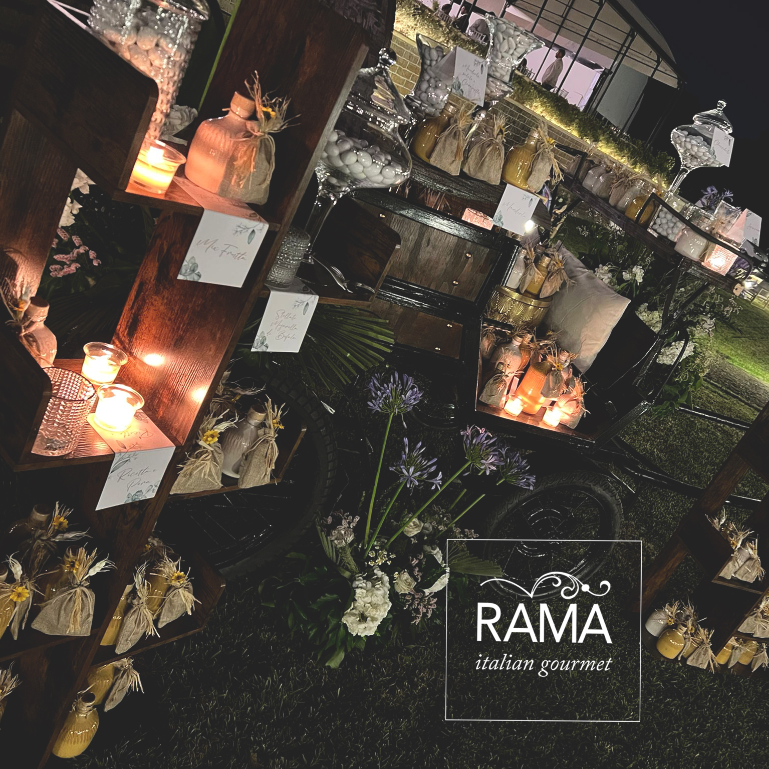 appoggiati su tavoli nudi sui quali insieme alle venature del legno scorrevano lunghissimi centrotavola con fiori di campo e cilindri con candele galleggianti. Essenziale ed elegantissima allo stesso tempo, la postazione di ogni commensale è stata completata da un menù fuori formato, appoggiato nel piatto senza coprirne la bellezza, dagli angoli arrotondati e decorato col disegno di delicate foglioline di eucalipto, in linea con la partecipazione di nozze. Menù e partecipazione di nozze, così come tutti i cartellini e le etichette che hanno completato l’angolo dei dolci e la confettata sono stati progettati dal reparto grafico di Rama Eventi di cui è responsabile Cristina Senatore.