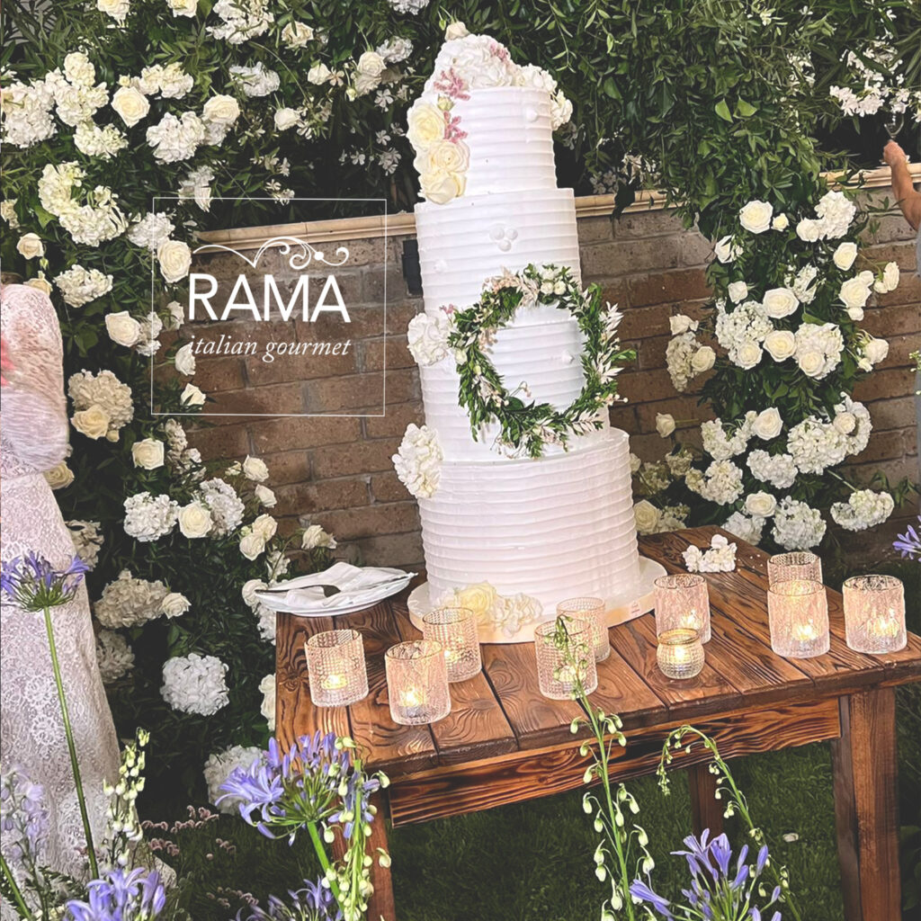 la torta, a più piani e in panna rigata, alta semplicissima ed elegante, è stata allestita per il taglio su un tavolo immerso nei fiori, ma per quanto apparentemente semplice la torta era veramente insolita!