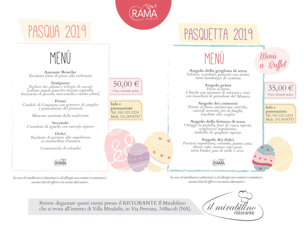 Anche quest’anno Rama vi propone il suo menù di Pasqua e Pasquetta presso il Ristorante Il Mirabilino, all’interno di Villa Mirabilis. Poterete rilassarvi e godere del meraviglioso clima primaverile, il risveglio della natura con i suoi colori e profumi, immersi nell’ambiente naturale della splendida location! Villa Mirabilis infatti, lo ricordiamo, sorge in una delle zone più belle e antiche del mondo! A pochi metri di distanza dalla Villa sorge l’area archeologica di Baia, l’antichissima città sommersa dalle acque marine a causa del bradisismo, dove ieri nella prima puntata televisiva del suo nuovo programma  “Meraviglie, la penisola dei tesori”, su Rai 1, Alberto Angela si è immerso facendo delle riprese straordinarie in una emozionante nuotata fra mura antiche, botteghe, case, scoprendo mosaici perfettamente conservati dalla mano del mare!