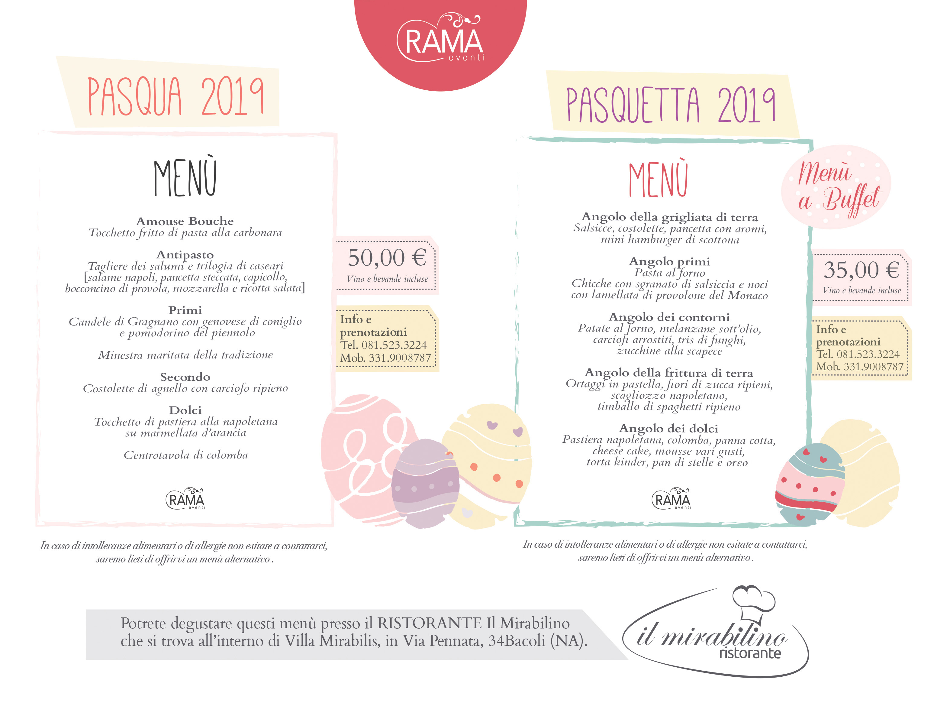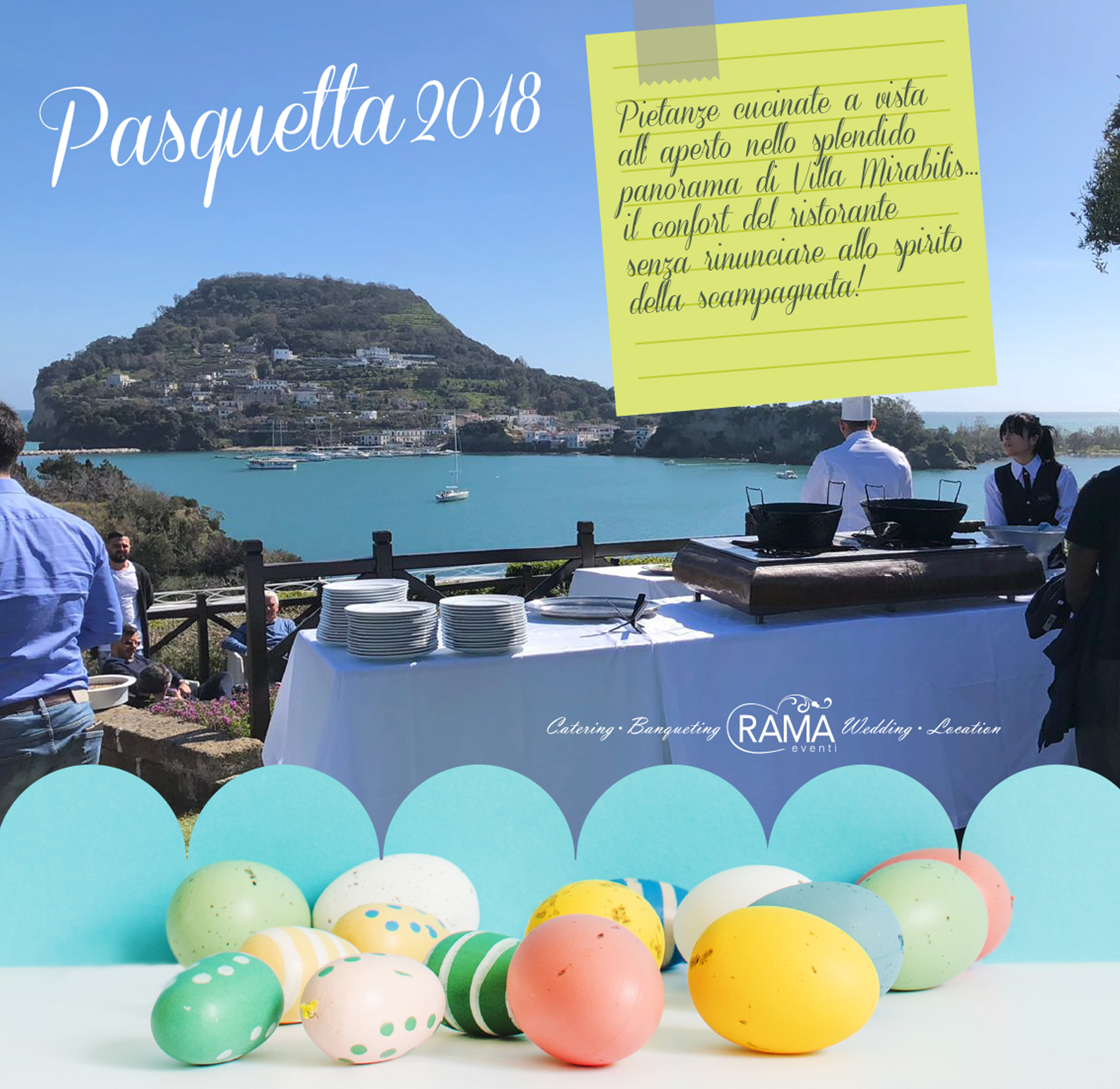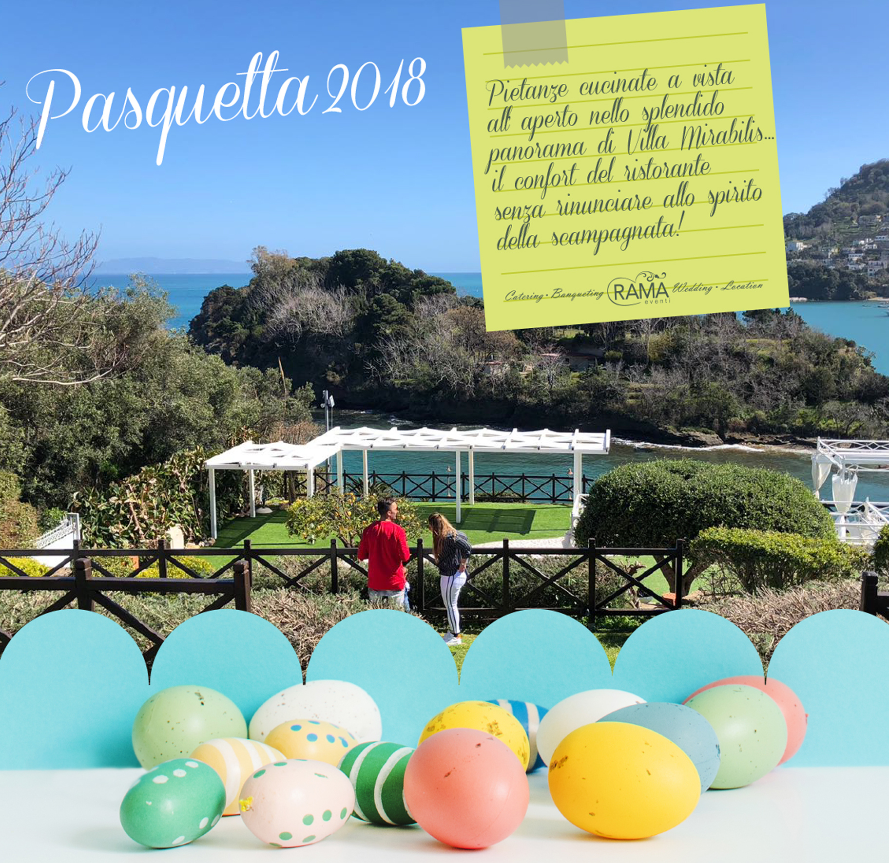 Anche quest’anno Rama vi propone il suo menù di Pasqua e Pasquetta presso il Ristorante Il Mirabilino, all’interno di Villa Mirabilis. Poterete rilassarvi e godere del meraviglioso clima primaverile, il risveglio della natura con i suoi colori e profumi, immersi nell’ambiente naturale della splendida location! Villa Mirabilis infatti, lo ricordiamo, sorge in una delle zone più belle e antiche del mondo! A pochi metri di distanza dalla Villa sorge l’area archeologica di Baia, l’antichissima città sommersa dalle acque marine a causa del bradisismo, dove ieri nella prima puntata televisiva del suo nuovo programma  “Meraviglie, la penisola dei tesori”, su Rai 1, Alberto Angela si è immerso facendo delle riprese straordinarie in una emozionante nuotata fra mura antiche, botteghe, case, scoprendo mosaici perfettamente conservati dalla mano del mare!