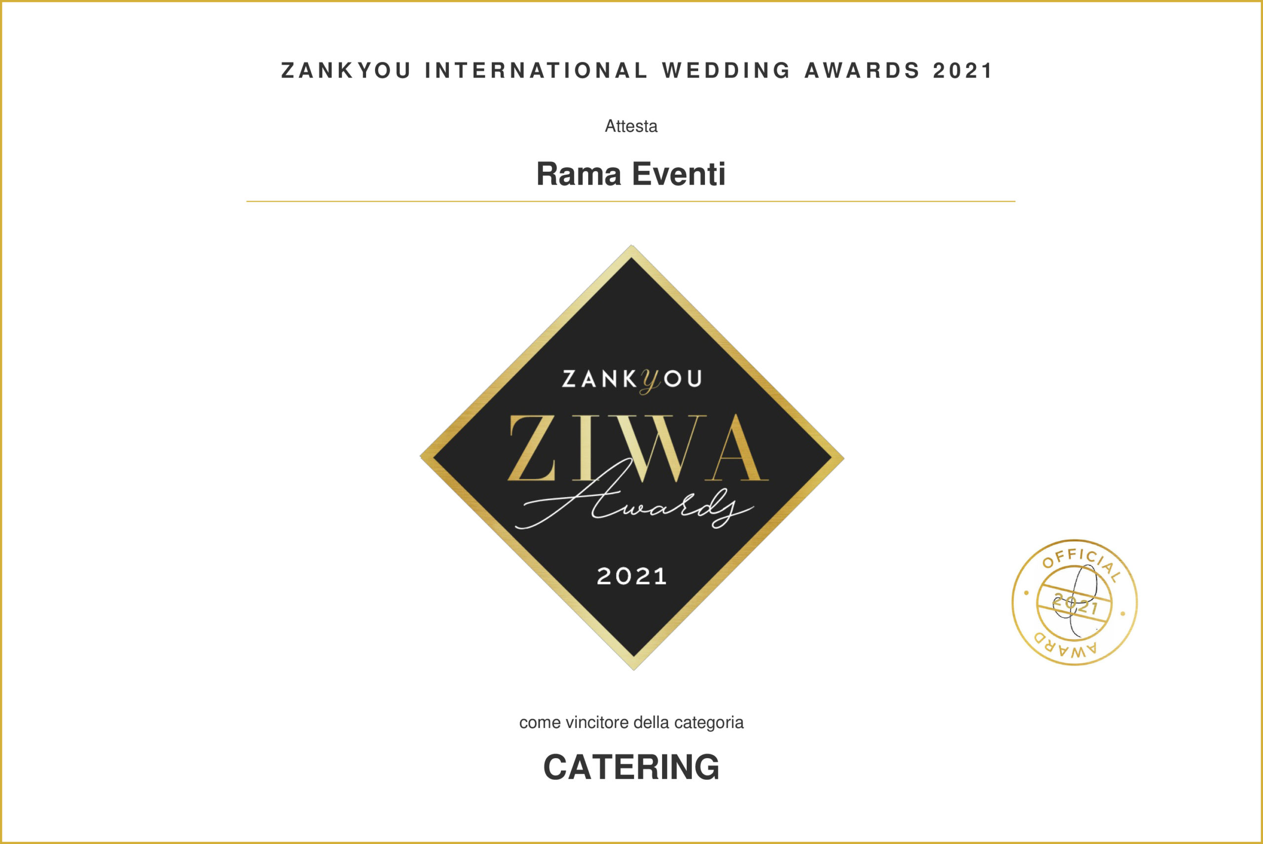 Zankyou ha annunciato i vincitori del premio ZIWA 2021 (Zankyou International Wedding Awards) per i migliori professionisti nel settore del matrimonio e per il secondo anno consecutivo Rama Italian Gourmet vince nella categoria Catering.